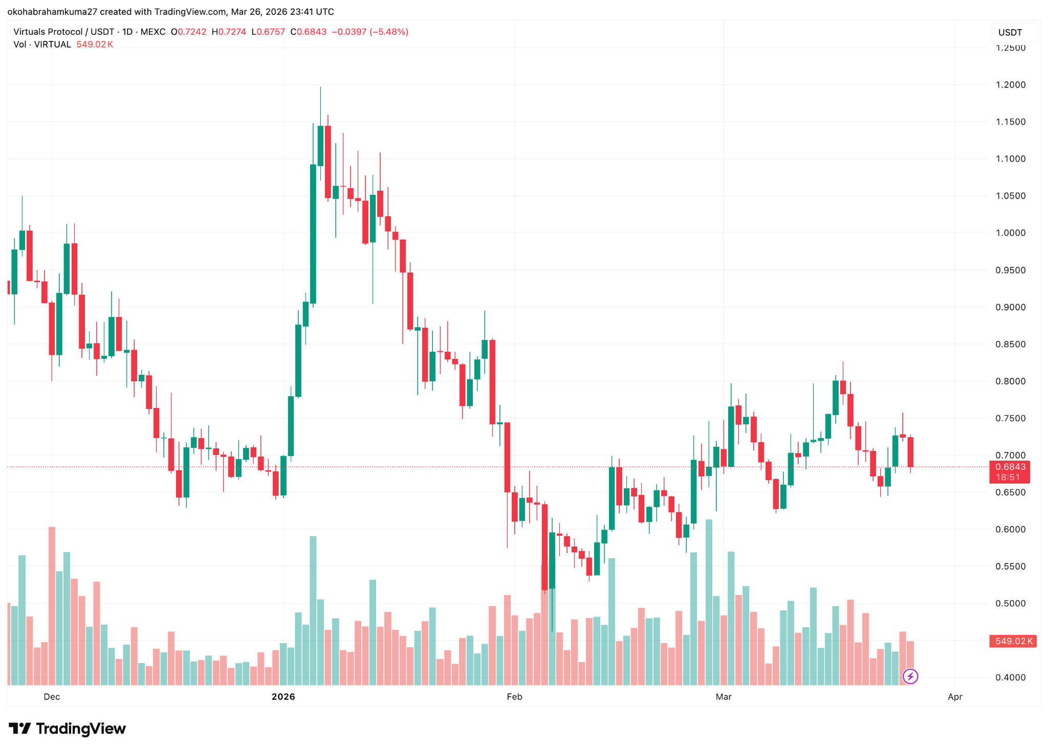 Virtuals Protocol recently connected with the Arbitrum network, allowing AI agents to interact with decentralized finance apps. It’s an interesting concept, but the market isn’t responding well. The fear score is at just 10, sentiment is fully negative, and short-term forecasts predict a nearly 25% drop, from about $0.70 down to $0.52.