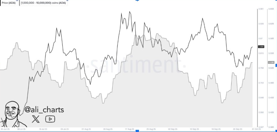 Whale accumulation has resumed, with large holders acquiring 70 million ADA within a week and now holding 15% of the total supply. This is seen as a solid bullish indicator by analysts, and has the potential to push ADA above $1 in the short term.