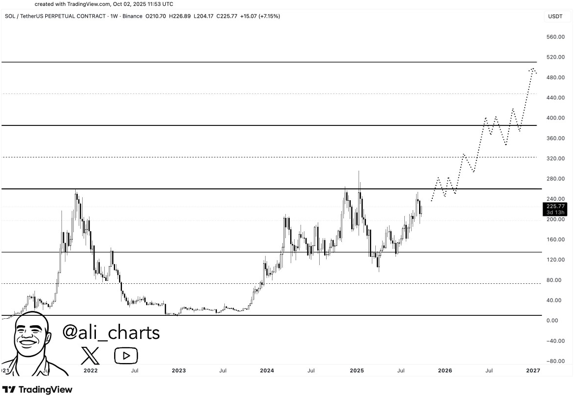 Solana made a spectacular recovery as price momentum gains strength above the $250 level. Analysts, such as Ali, forecast that a move above $260 will spark an upward surge to $520, which is almost twice the current price.
