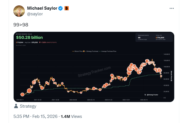 BTC currently trades around $68,000 on February 16 after crashing from its October 2025 all-time high of $126,000, marking a brutal 47% correction. The altcoin news on Bitcoin actually shows institutional conviction with Michael Saylor’s Strategy adding 1,142 BTC for $90 million at an average price of $78,815, bringing total holdings to 714,644 BTC worth $54.35 billion.