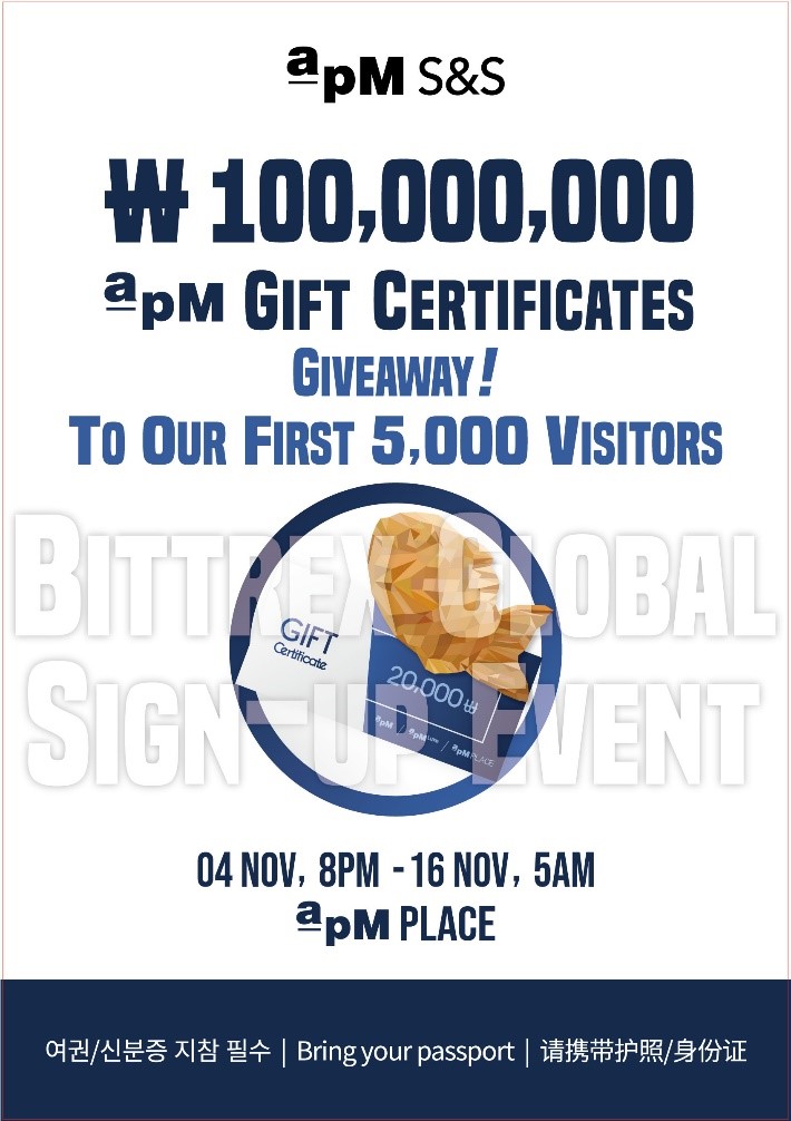 The event will be held at apM PLACE for all customers and visitors of apM, apM PLACE, and apM Luxe from 4 November, 20:00 to 16 November, 05:00 KST. KRW 20,000 worth of the apM gift certificates will be provided to the first 5,000 event participants who completes the pre-registration of apM Members mobile application and sign-up and KYC for the Bittrex Global at the event venue. The gift certificates can be redeemed at clothing shops of apM, apM PLACE, and apM Luxe. Complimentary Korean traditional waffles ‘Boongeo-ppang’ will also be offered to all event participants during the event.