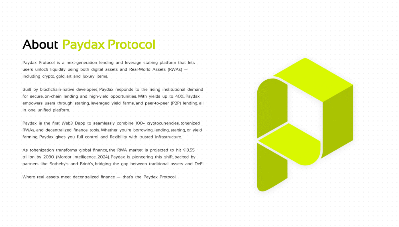 Borrowers also gain a massive upgrade in the PayDax economy. Rather than selling assets to unlock cash, users can collateralize crypto or tokenized RWA (like luxury watches or artwork) and have them tokenized and stored by Sotheby’s and Brinks to instantly access liquidity.