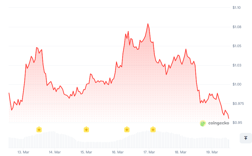 SUI was trading around $0.96 on March 19, consolidating near a key psychological level after a volatile start to the year. The network has genuine pros: parallel transaction processing, a developer-friendly architecture built on the Move language, and an expanding DeFi ecosystem anchored by the recent SuiUSDe stablecoin launch.