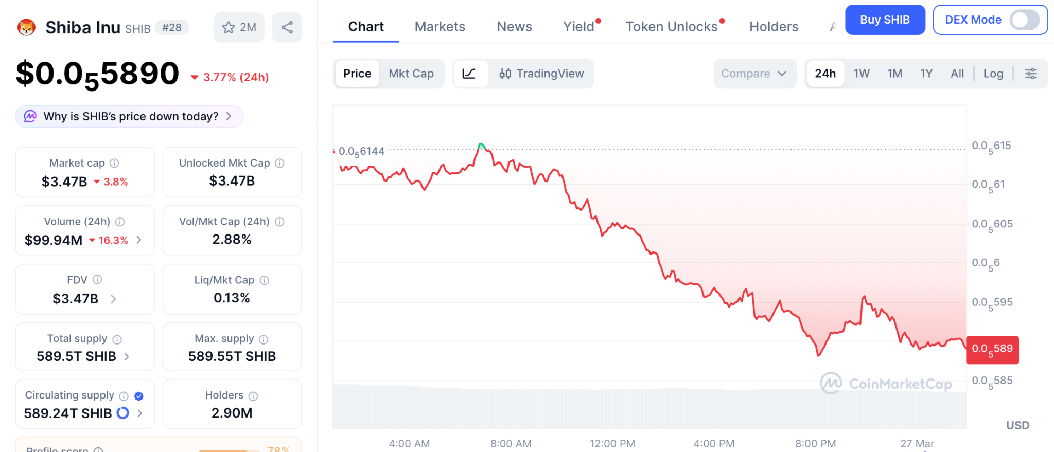Shiba Inu trades near $0.0000058 as of March 27 holding above February lows as the meme sector stabilizes, according to CoinMarketCap.