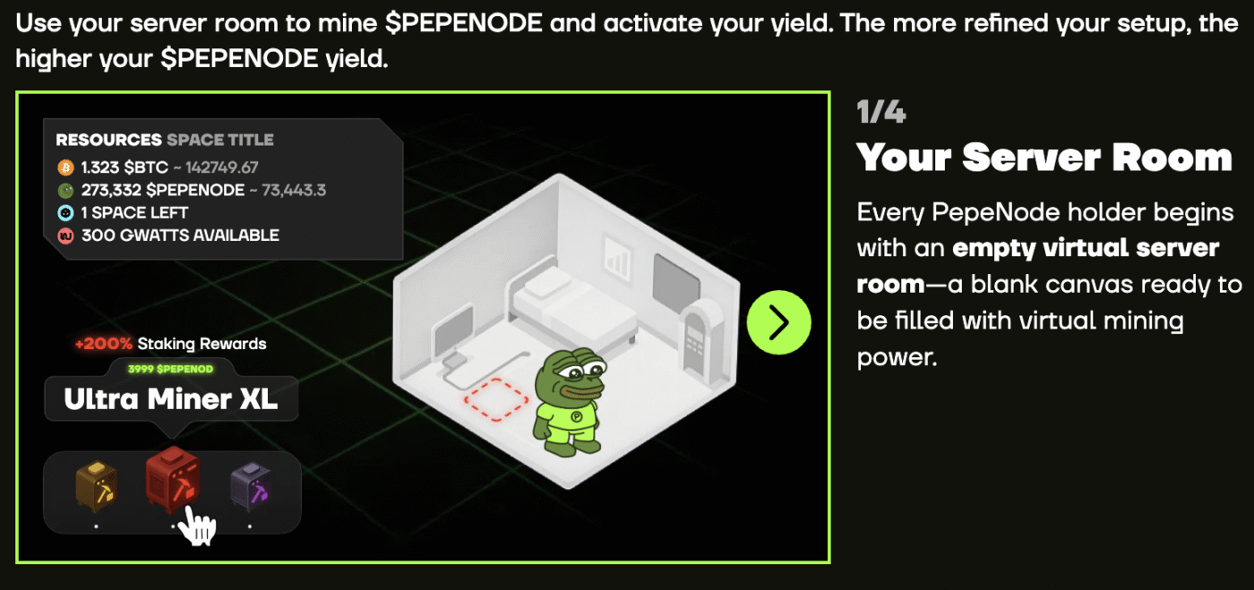 Players start with a virtual server room, where they can spend PEPENODE tokens to purchase “Meme Nodes” and begin earning mining power. 70% of PEPENODE tokens spent in the store will be burned, creating deflationary pressure that could support long-term price growth.