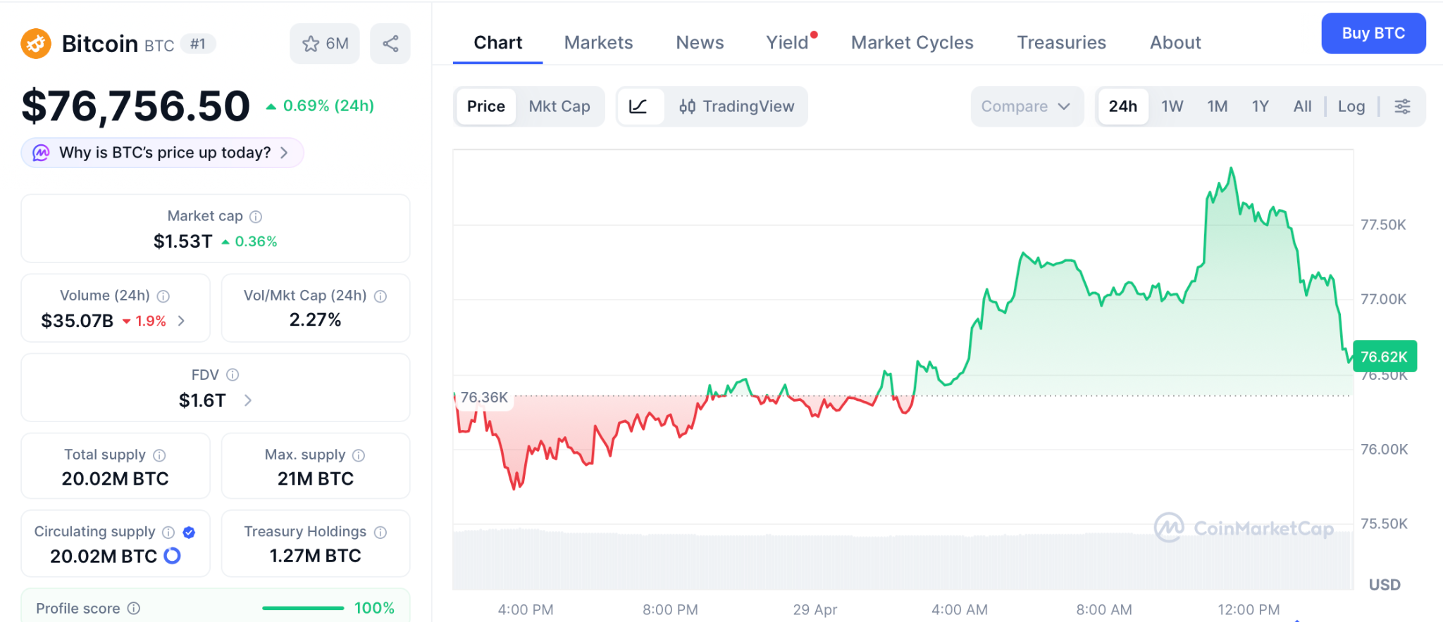 Bitcoin (BTC) trades at $76,756 according to CoinMarketCap after pulling back from a $79,337 high earlier this week. BTC gained 18% over the past month, and spot ETFs added $2.5 billion in April, the strongest monthly inflow of 2026 so far.