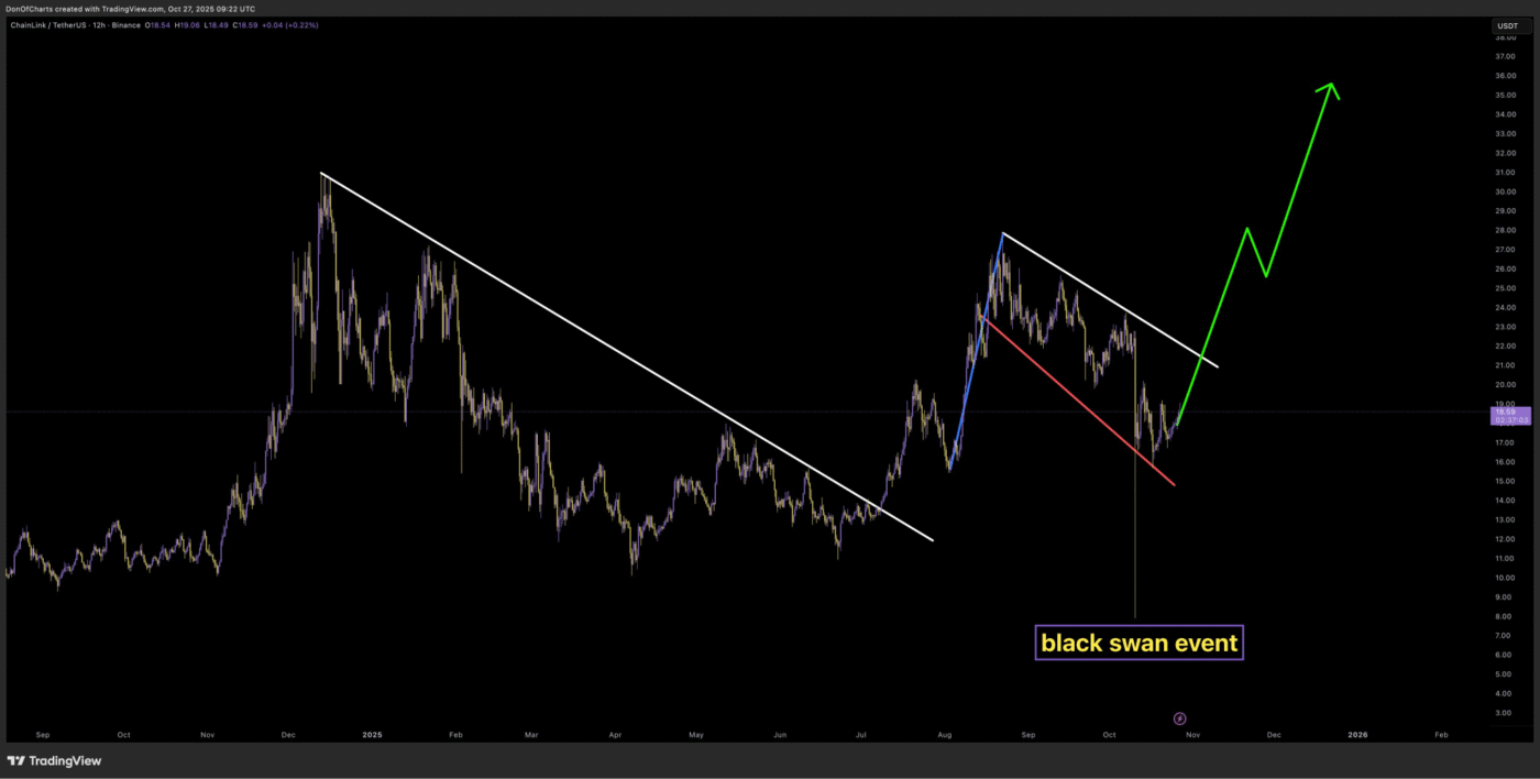 Analysts observe that LINK is now trading in a downtrending channel, with good upper resistance and lower support levels. Following a low-level hit, LINK seems to be forming an upside breakout. An established breakout above resistance may drive the token to $22-$23, and the long-term objective of $35 should momentum sustain.