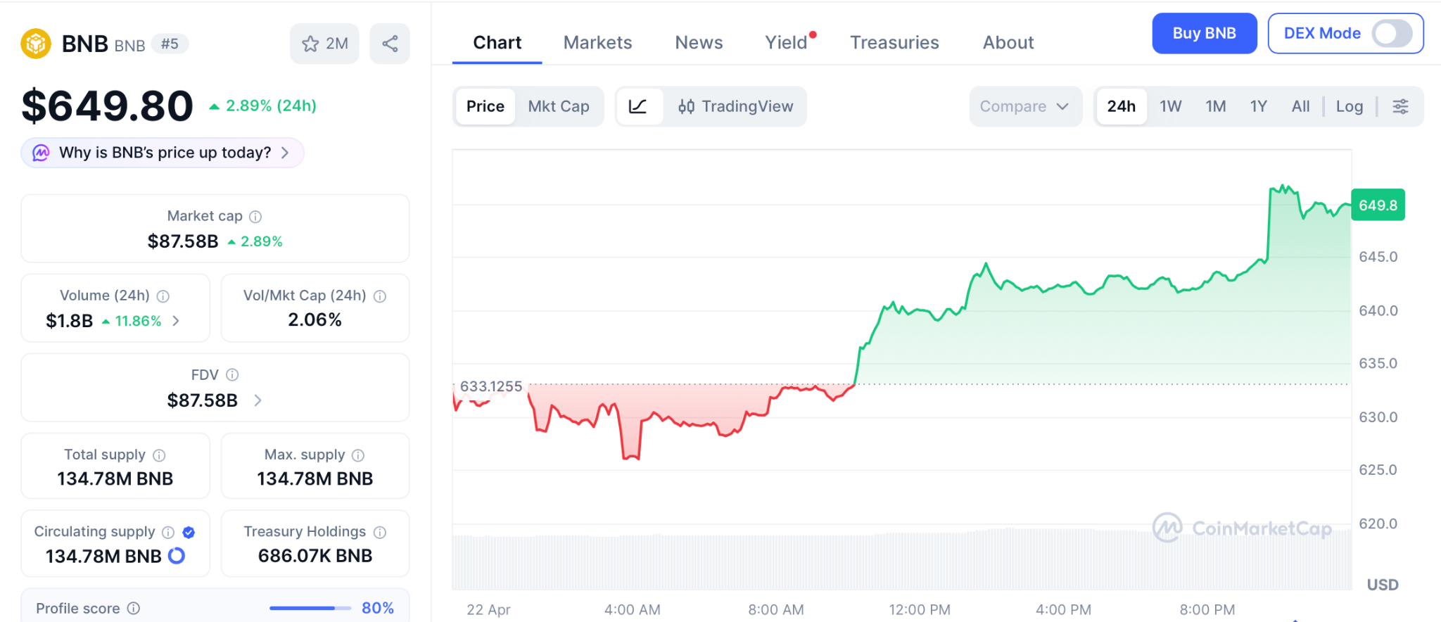 BNB trades near $649 on April 22, up 2.89% in 24 hours per CoinMarketCap, and roughly 53% below its October 2025 all time high of $1,369.99. The 35th quarterly burn removed 1.57 million BNB worth $1.02 billion on April 15, cutting supply toward the 100 million target.