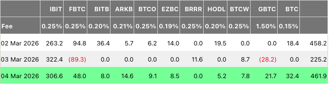 - US-based spot Bitcoin ETFs attracted $462 million on Wednesday, marking three consecutive days of positive inflows