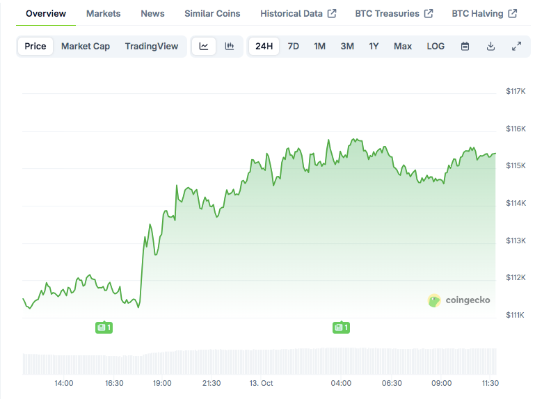 CoinGecko data shows Bitcoin trading at $115,122, up 2.93% in the past 24 hours but still down 7.05% over the week. Daily volume hit $93.5 billion, reflecting heavy rotation as traders reposition after the crash.
