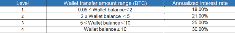The interest rate of the wallet depends on the deposit amount and it varies from 18% to 30%. Deposits in the wallet are independent of the trading account. The deposits can not be used for trading nor will it be calculated as margin. So even if your positions get liquidated during huge price swings, the deposits in the wallet will still be intact. There is no fee for transfer between the trading account and the wallet.
