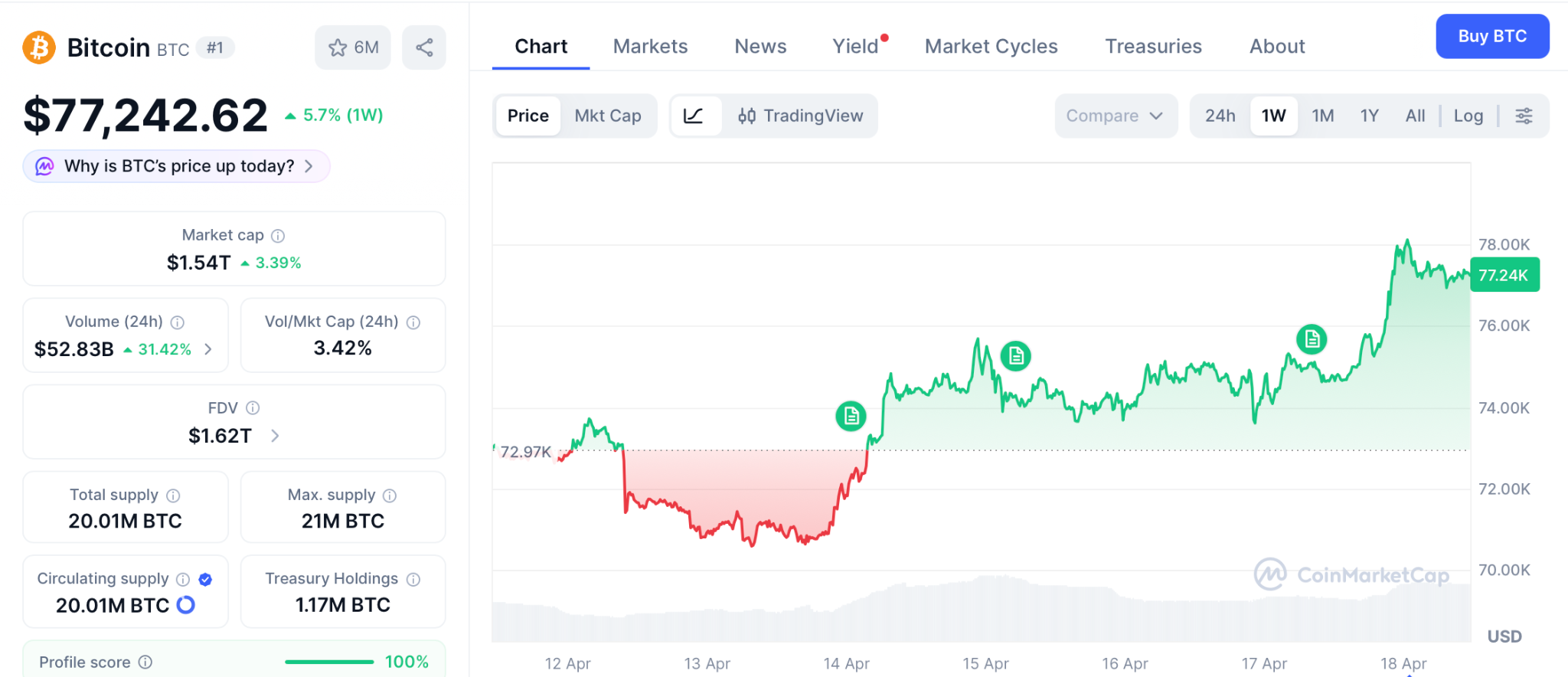 Bitcoin climbed to $77,242 on April 17 per CoinDesk, up nearly 5% over 24 hours and breaking out of the range that had capped prices since February, with Trump confirming Iran would keep the Strait open and crude sliding below $85. Treasury firms including Strategy tacked on 13%, Trump-backed American Bitcoin jumped 21%, and Ether, Solana, and XRP each posted 4% to 5% gains on the same session.