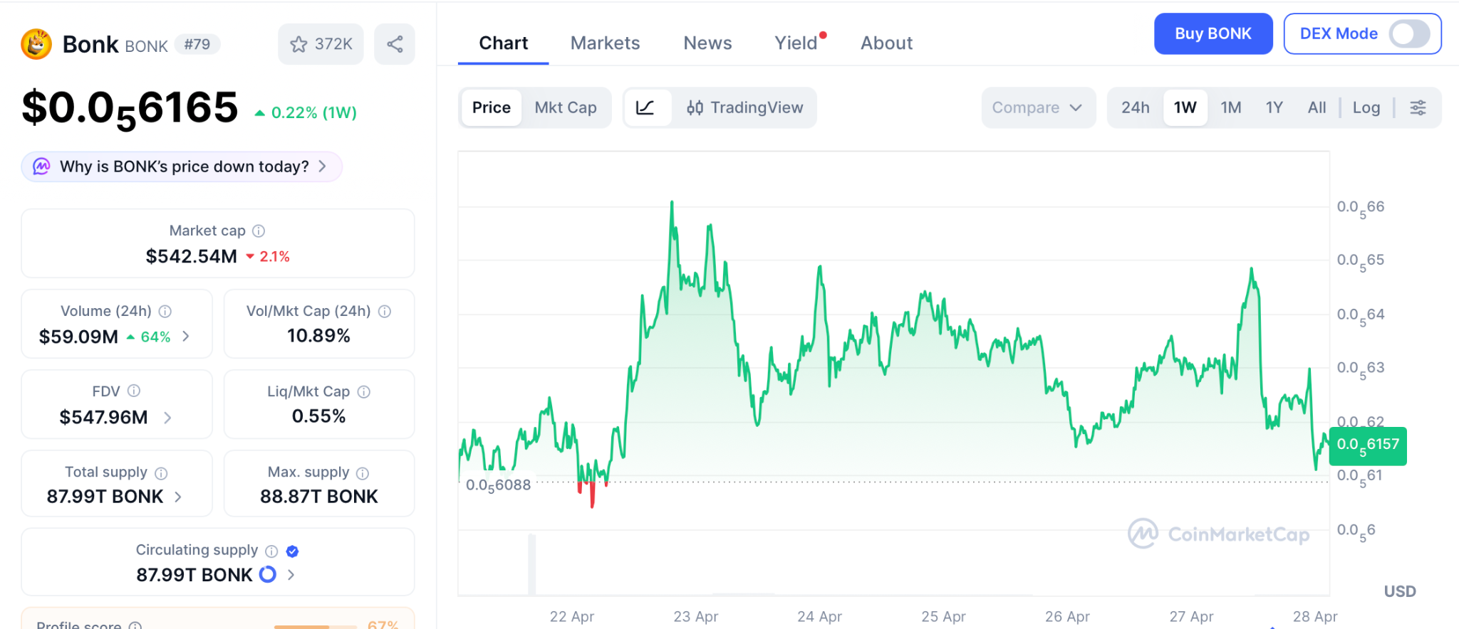 Bonk (BONK) trades at $0.0000061 per CoinMarketCap, up 75% in 30 days after clearing the trendline that held since February. Early BONK buyers near launch turned small positions into serious wealth, earning Bonk the leading meme coin spot on Solana.