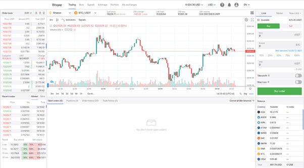 In the latest update, Bitsgap divided the trading terminal into two parts. The first part is a decision making right-side panel where users can execute orders and see their available balance on a selected cryptocurrency exchange. The second part is a left side panel with relevant cryptocurrencies infographics. Analyze the market first and then make decisions.