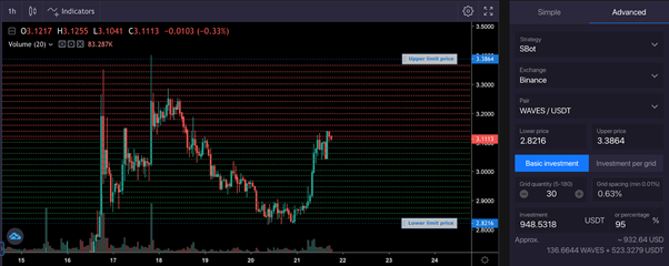 In a “Grid strategy,” traders and investors allocate the desired investment sum, which is being proportionately distributed by the algorithm. Bitsgap bots are being programmed to buy a cryptocurrency at a lower price to sell it later at a higher price, trading in a pre-defined trading range. As simple as that. Optimal market scenarios are the sideways and rising markets. On a falling market, a cost-average effect and a profit generated by the bot offsets the negative value change of a base currency.