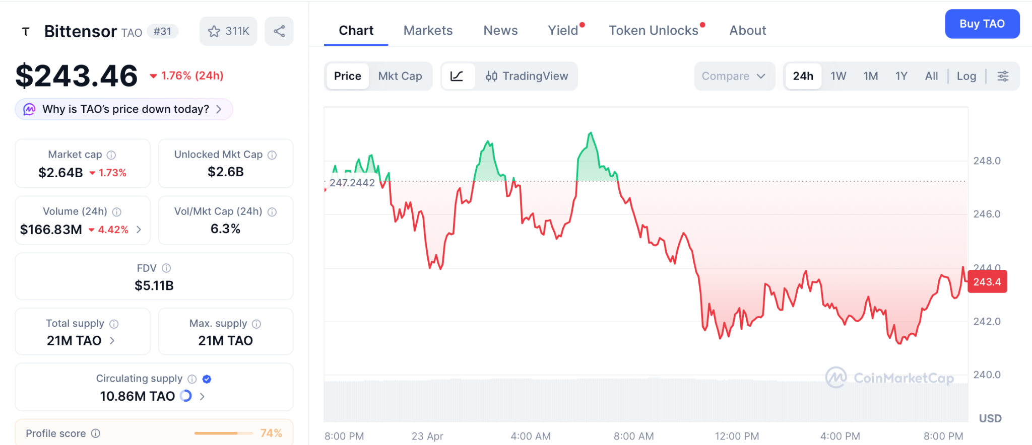 Bittensor (TAO) trades at $243 per CoinMarketCap, down 1.76% on the day and 23% on the week after the Covenant AI exit triggered a sell-off.