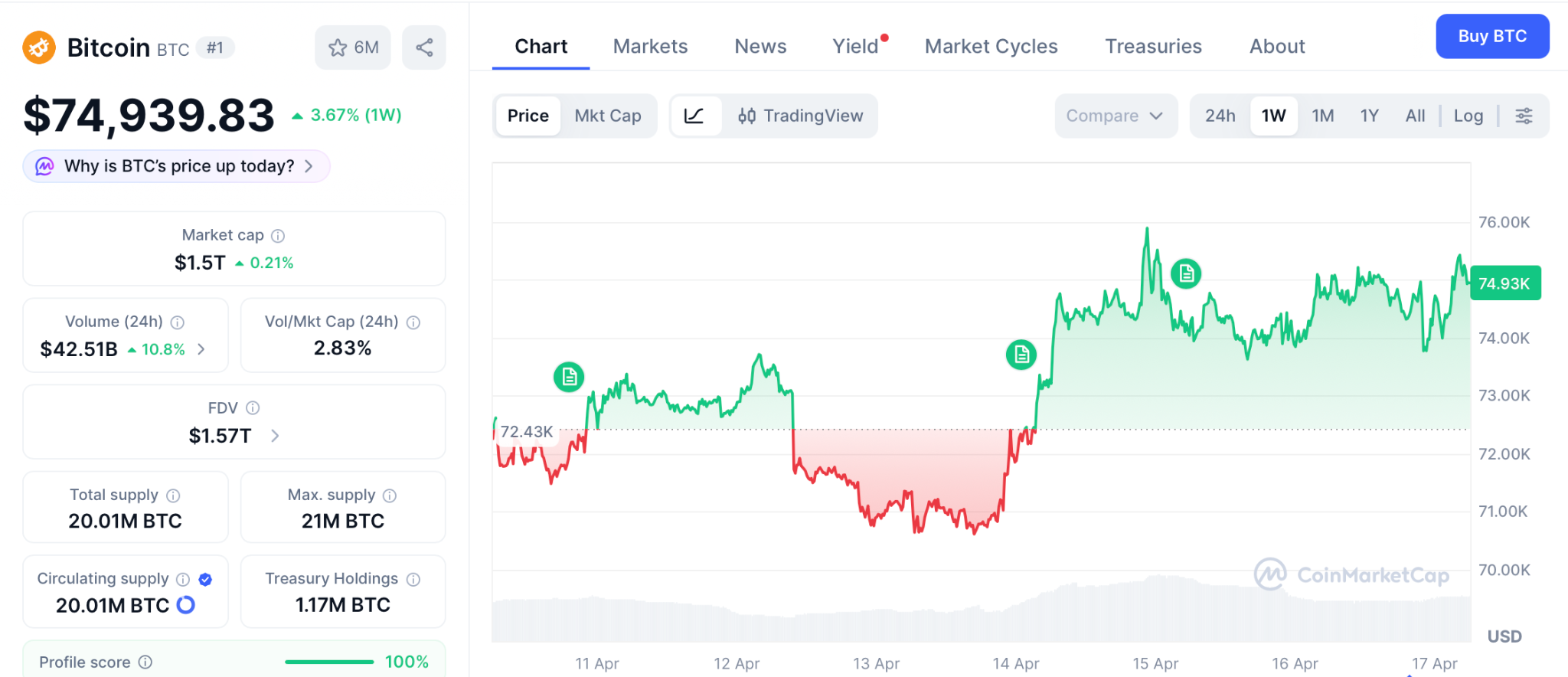 Bitcoin trades at $74,939, up 0.4%, with support at $71,780 and resistance at $76,016 according to CoinMarketCap.
