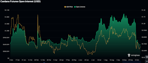 Futures open interest for ADA stands at 648.56 million dollars, based on data from Coinglass. This is down from more than 1.8 billion dollars reached in mid-September. The drop has followed a decline in price, with ADA moving below the 0.70 level.