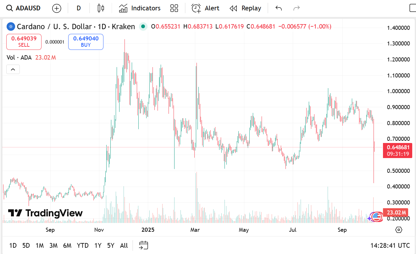Cardano (ADA) is a popular layer-one network, but it has grown slowly. The token currently trades at $0.6490 with 1.23% gains in the last 24 hours, a market cap of $29.23 billion, and $1.07 billion trading volume, down by 4.15%.