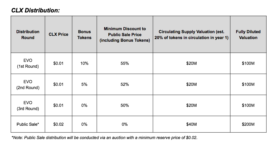 The price at which EVO participants can purchase CLX tokens is $0.01. This represents a significant discount to the price at which CLX tokens will be distributed via an eventual public sale, where tokens will be auctioned at a minimum bid price of $0.02 per CLX.