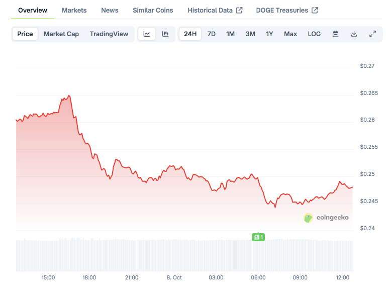 At press time, Dogecoin traded at $0.2478 with a 24-hour volume of $3.76 billion, according to data from CoinGecko. Prices declined 4.85% in the last day but gained 3.17% across the past week.