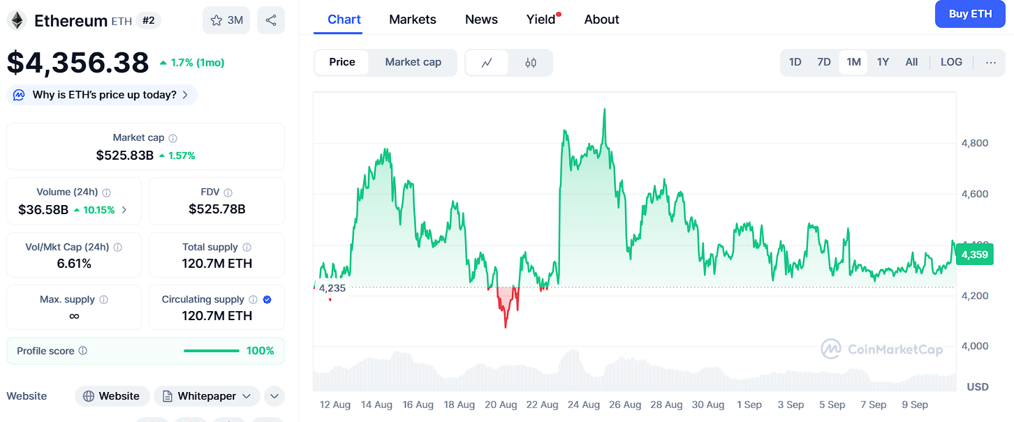 Ethereum (ETH) remains one of the strongest properties in the crypto market, trading near $4,380 in early September 2025. As the second-largest cryptocurrency, ETH keeps steering the way in decentralized finance (DeFi), NFTs, and smart contract programs.