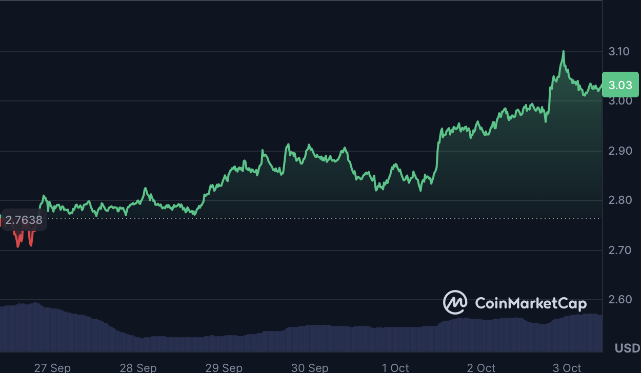 XRP has long been at the heart of institutional debates, thanks to its unique regulatory journey. Currently priced at $3.02, XRP is showing modest gains of 0.06% on the day and 1.94% over the week. Despite the positive trend, XRP continues to struggle against overhead resistance, a sign that enthusiasm has yet to translate into explosive momentum.