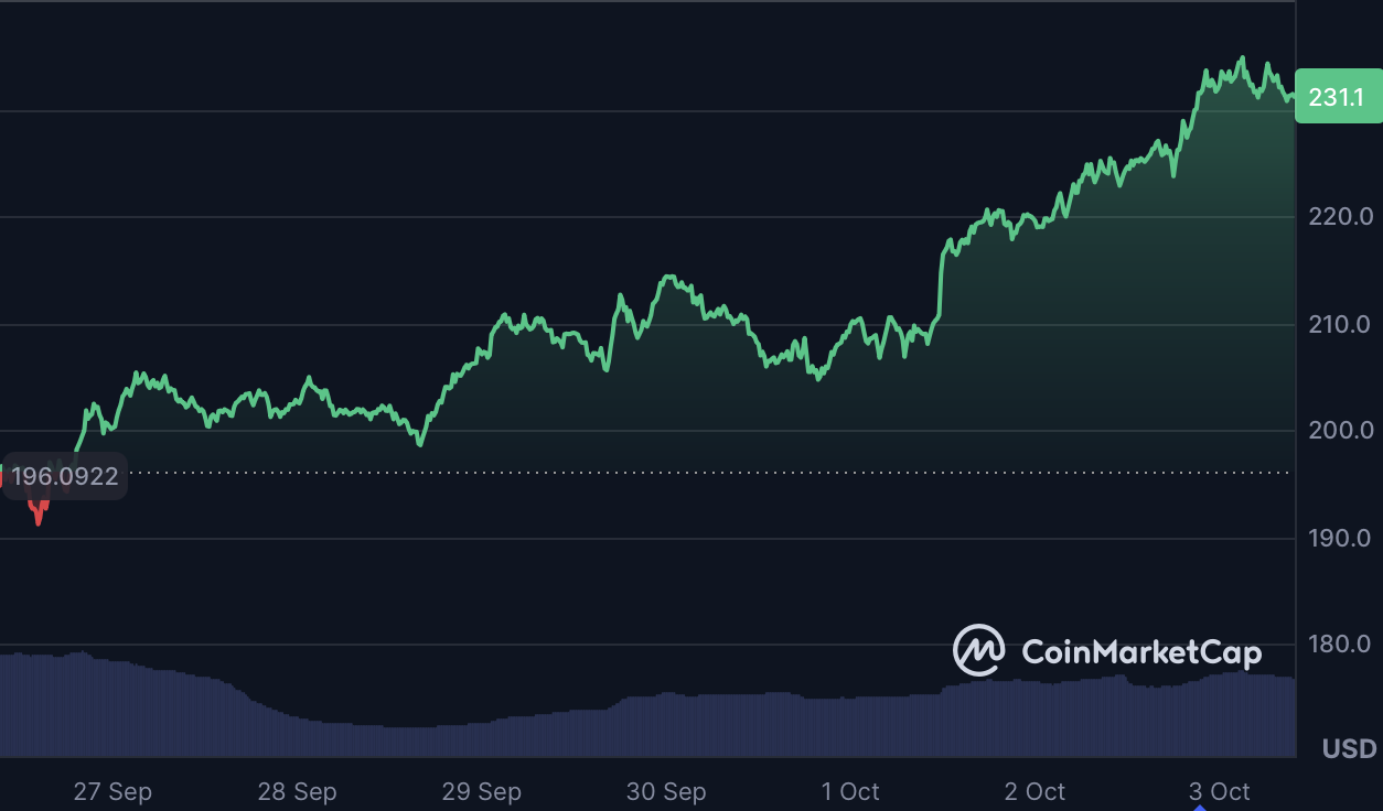 Solana’s rally back to $231.41 has made it one of the most talked-about altcoins of the moment. Daily gains sit near 0.03%, weekly performance is up 3.39%, and the monthly rise of 17.77% demonstrates sustained strength. For many, Solana is no longer just a high-performance chain—it’s an ecosystem capable of commanding institutional interest.