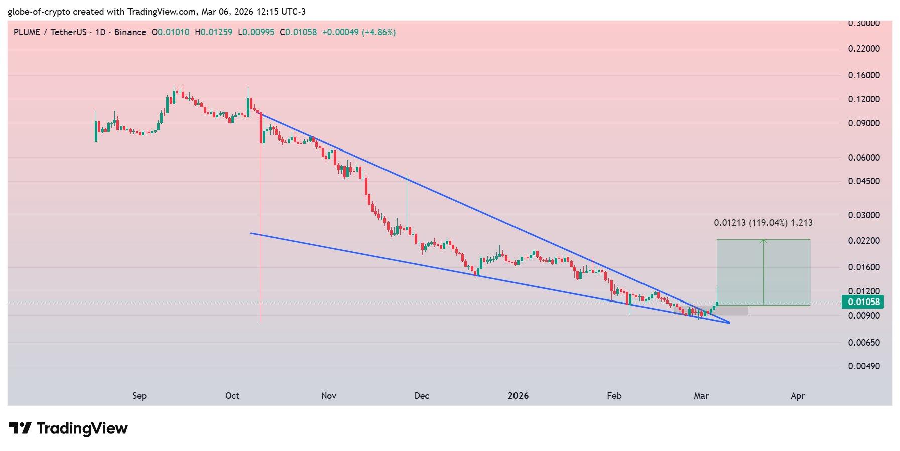 As of March 9, the Plume coin was trading at $0.013, a 57% increase from its all-time low. The Plume crypto is one of the few coins that has shown resilience amid the ongoing market volatility. Globe of Crypto forecasts that the Plume price might pump to $0.022 soon.