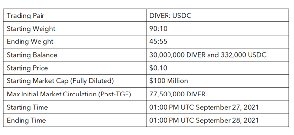 - Divergence’s LBP will start with a token price of $0.1, which indicates a $100 million fully diluted valuation. DIVER price will be auto-adjusted lower immediately after the sale opens, as per the LBP mechanism.