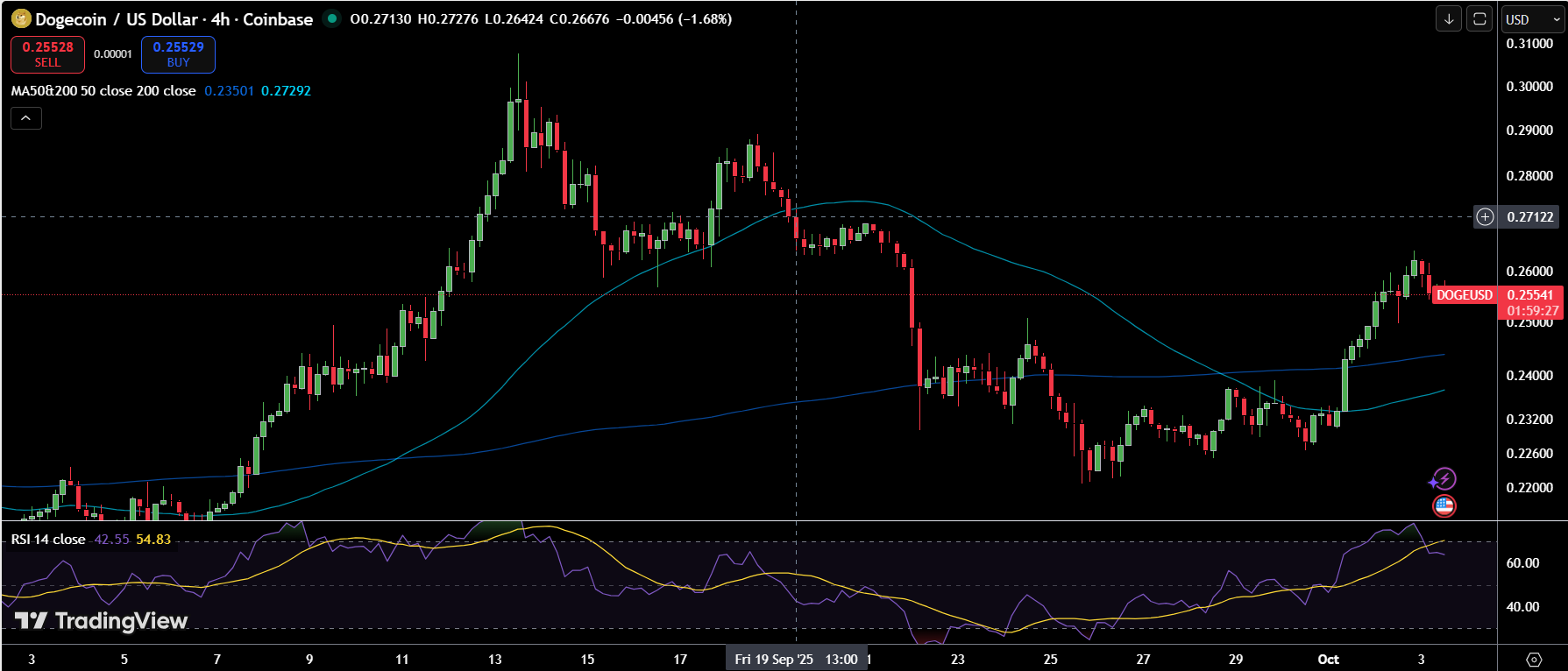 The Dogecoin price is currently hovering around $0.26, after experiencing a slight dip of -0.15% to -0.8% in the past 24 hours. This slight bearish momentum is coming after DOGE has seen a major run-up in price.