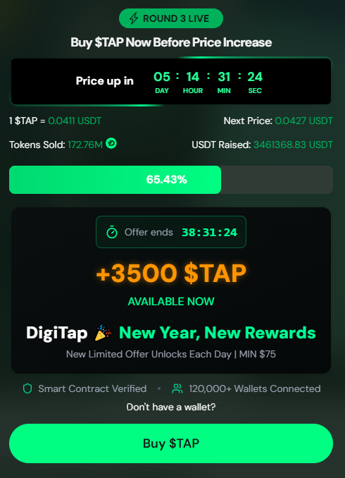 Investors believe the project will thrive in 2026, with over 120,000 wallets already linked to the presale dashboard. Moreover, over 172 million tokens have been sold, and Digitap has raised over $3.4 million.