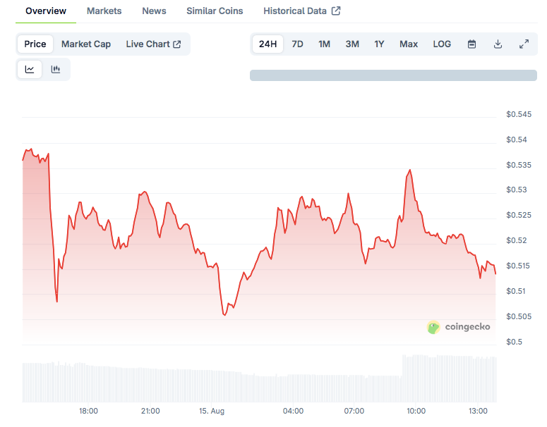 According to CryptoPulse, the $0.51–$0.52 level was the breakout point in the last rally, making it a crucial retest zone now. Price has dipped to $0.5158, per CoinGecko, down 4.14% on the day but still 21.97% higher over the past week.