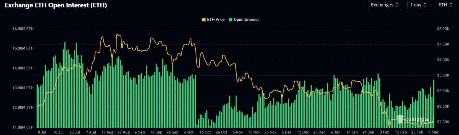 - Derivatives open interest surged nearly 15% to 13.43M ETH, marking the highest level since late January