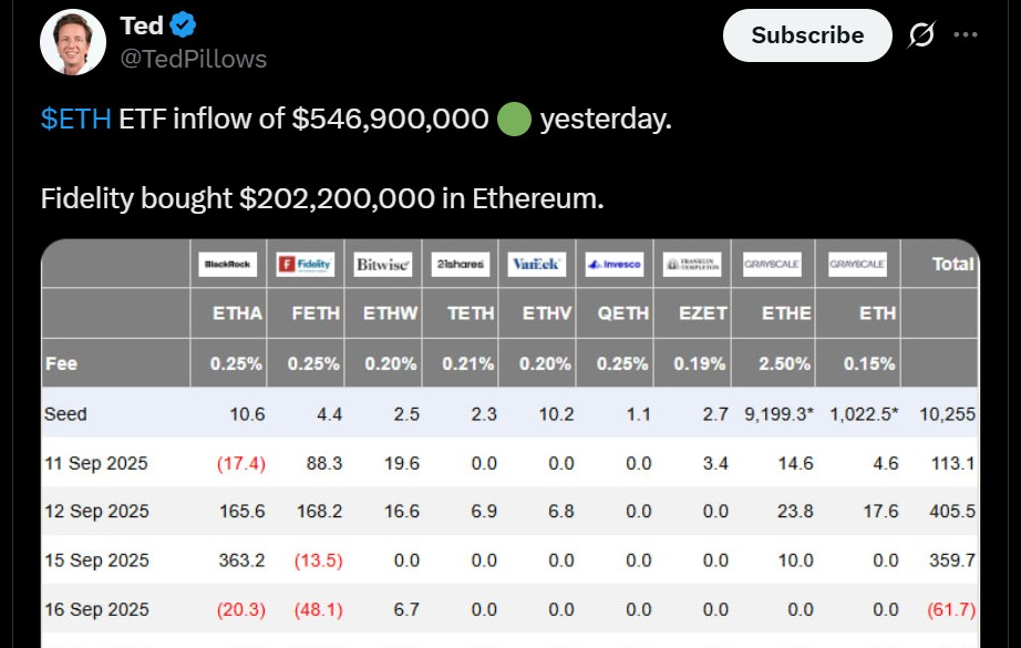 Moreover, the next leg higher is also being fuelled by institutional demand. Spot Ethereum ETFs recorded inflows of $546.9 million in one session, dominated by Fidelity with $202.2 million and BlackRock with $154 million.