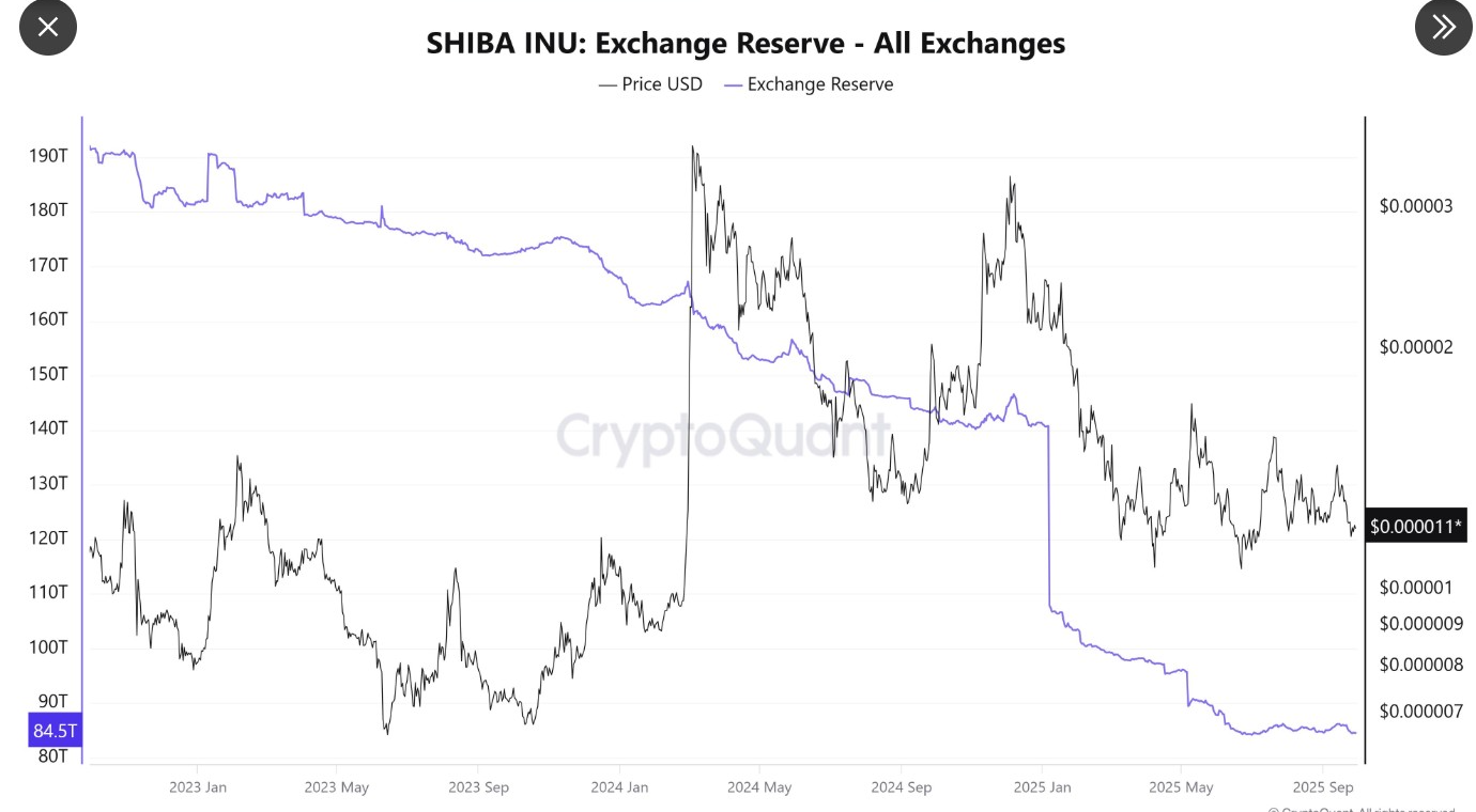 Meanwhile, Shiba Inu (SHIB) may be preparing for an “Uptober” breakout. Analyst Zayn revealed that SHIB exchange reserves have dropped to 84.55 trillion tokens, the lowest in two years. In January 2023, exchanges held nearly 190 trillion SHIB, meaning supply has fallen by more than 55%.