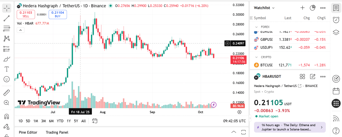 HBAR is trading at $0.21, with support from its enterprise adoption and network partnerships. Technical models show a possible move toward $0.28 to $0.30 in the weeks ahead.