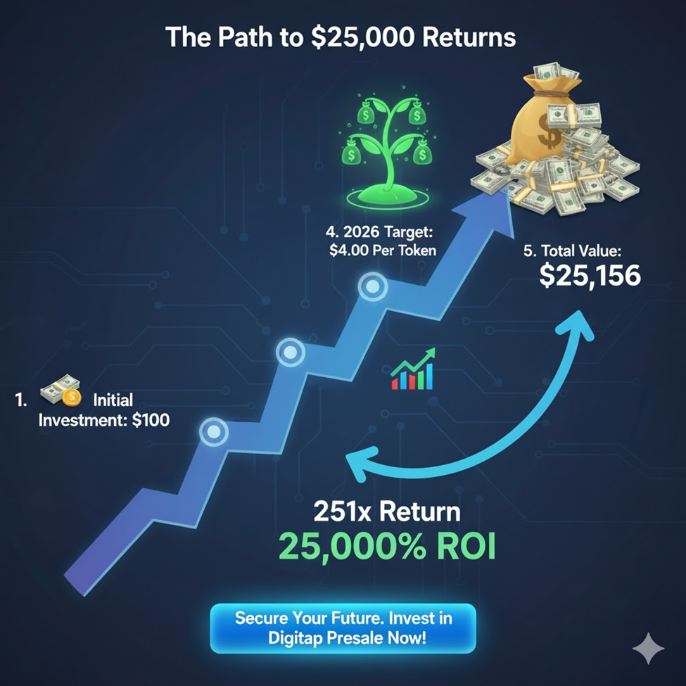 Technical models based on prior PayFi market expansion curves suggest that once Digitap lists on major exchanges, a 100x–150x multiple from presale levels is likely. Long-term projections place the 2026 target around $4.00 per token, translating to roughly 25,000% ROI — the kind of asymmetric potential that turns small entries into portfolio-defining wins.
