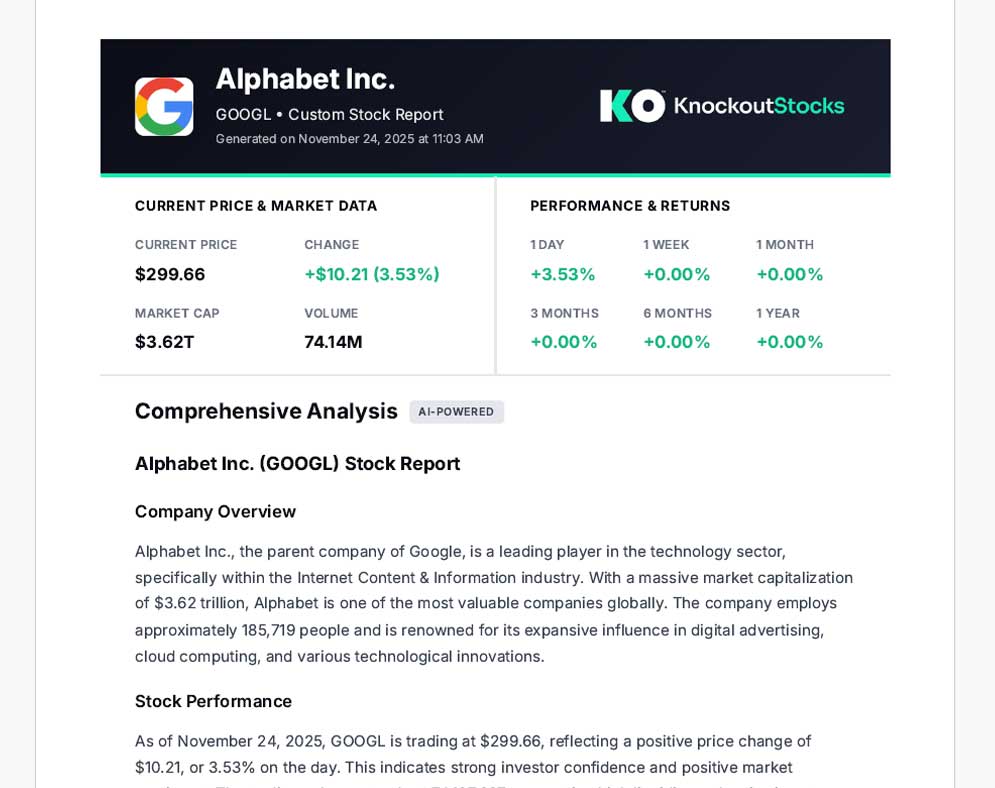 KnockoutStocks produces comprehensive AI-generated equity reports instantly upon request. Every report encompasses company background, financial stability assessment, critical performance indicators, market behavior analysis, current developments, and analyst perspectives—consolidated in a single document.