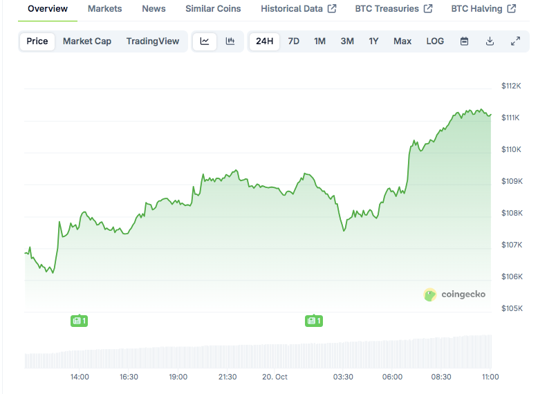 According to data shared by CoinGecko, Bitcoin trades at $111,273, marking a 4.22% daily increase but down 2.99% weekly. Despite the short-term uptick, traders appear cautious.