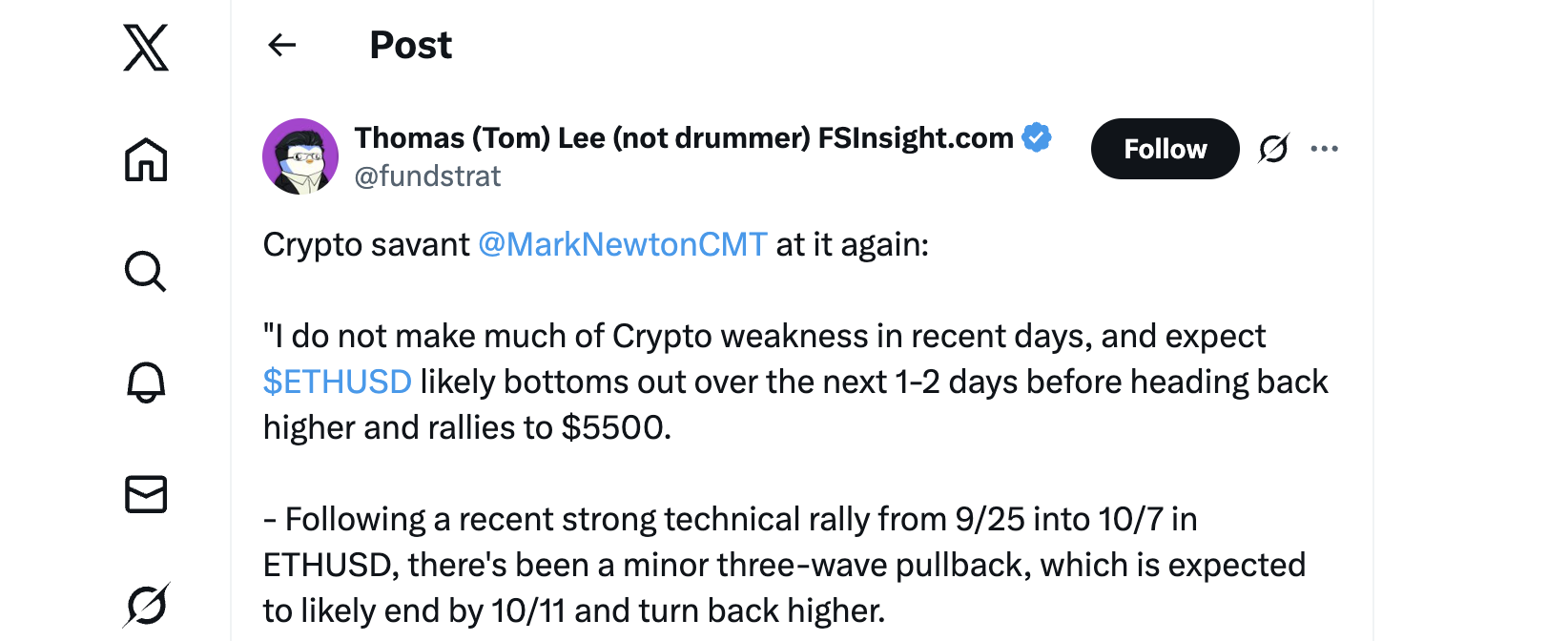 Fundstrat’s managing director Mark Newton expects Ethereum to rebound to $5,500 soon after its recent pullback. He said ETH likely hit its bottom near $4,200 and should soon begin another upward move. His analysis aligns with comments from Tom Lee, who shared the same outlook earlier this week.