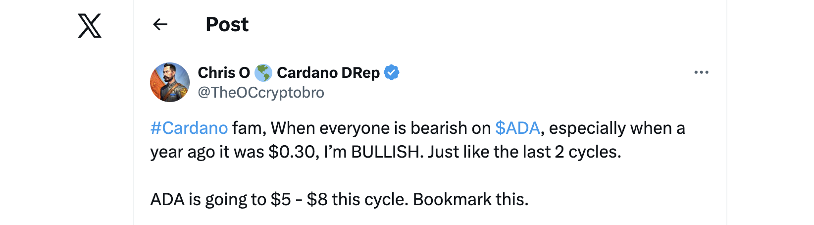 Despite recent price weakness, Cardano supporters stay confident in ADA’s long-term path. Community figure Chris O, a DRep in the Cardano ecosystem, predicts ADA will rise to between $5 and $8 this market cycle. That would be an 895% increase from its current $0.80 price level.