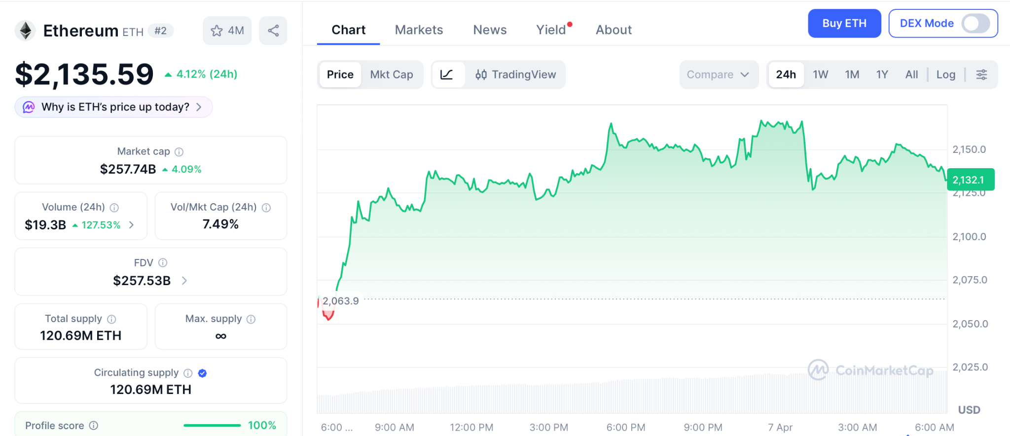 ETH traded at $2,100 on April 7, 2026, still 57% below its all time high according to CoinMarketCap. Bitmine holding 4.8 million coins shows institutional confidence.