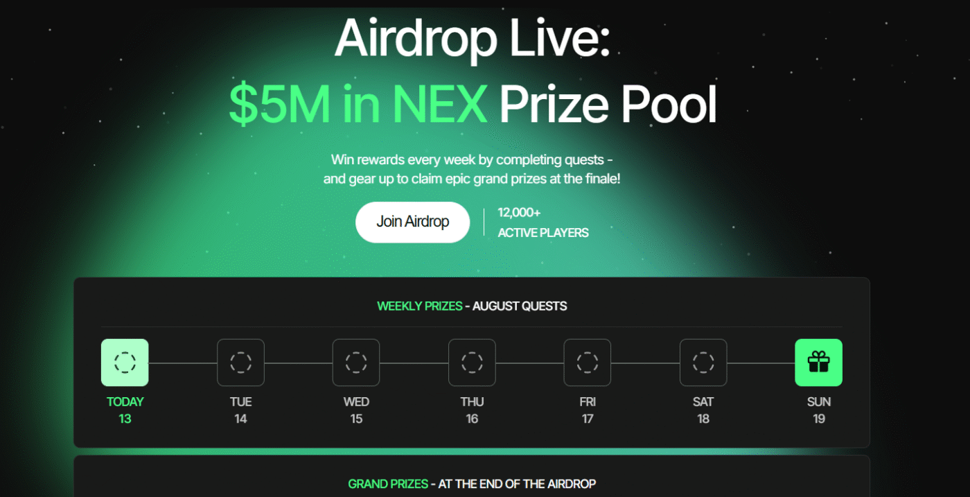 The Nexchain AI airdrop continues alongside the token presale, offering a $5 million NEX prize pool. Participants earn weekly rewards by completing quests, with larger prizes distributed at the finale. The campaign encourages consistent engagement, and the more users participate, the greater their reward potential.
