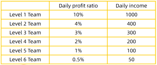 For example, if your teams at all levels earn $10,000 per day, your daily profit would be $1,000 + $400 + $300 + $200 + $100 + $50 = $2,050.