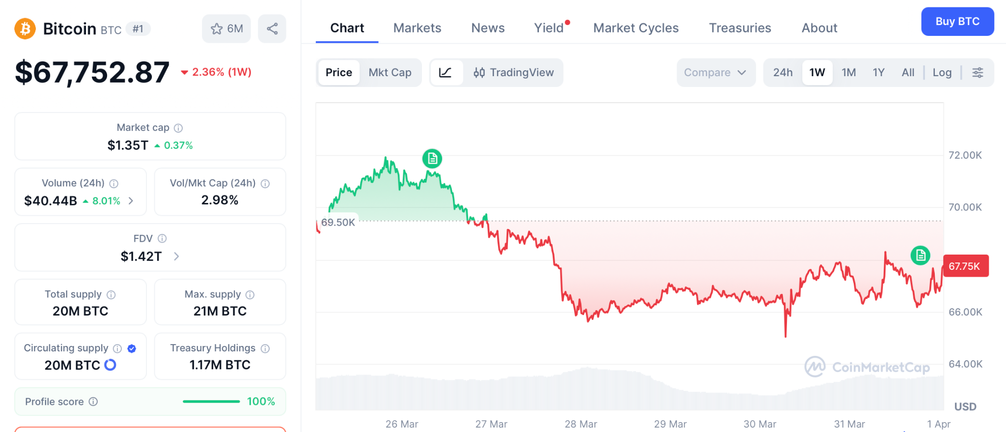 BTC traded near $67,752 on March 31, according to CoinMarketCap. Down 47% from highs. ETFs buying 100% of new supply proves permanent demand.