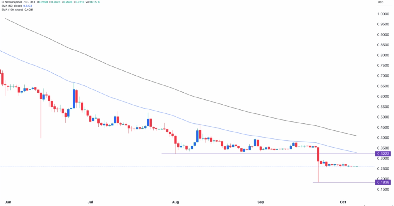 The core Pi Network price forecast centers on whether the $0.25 area can hold. A clean defense and a bounce toward $0.286 would improve structure and slow the downtrend. If that shelf breaks, bears may press toward $0.18, which is the measured move from the descending pattern. Momentum and volume have faded, so confirmation matters.
