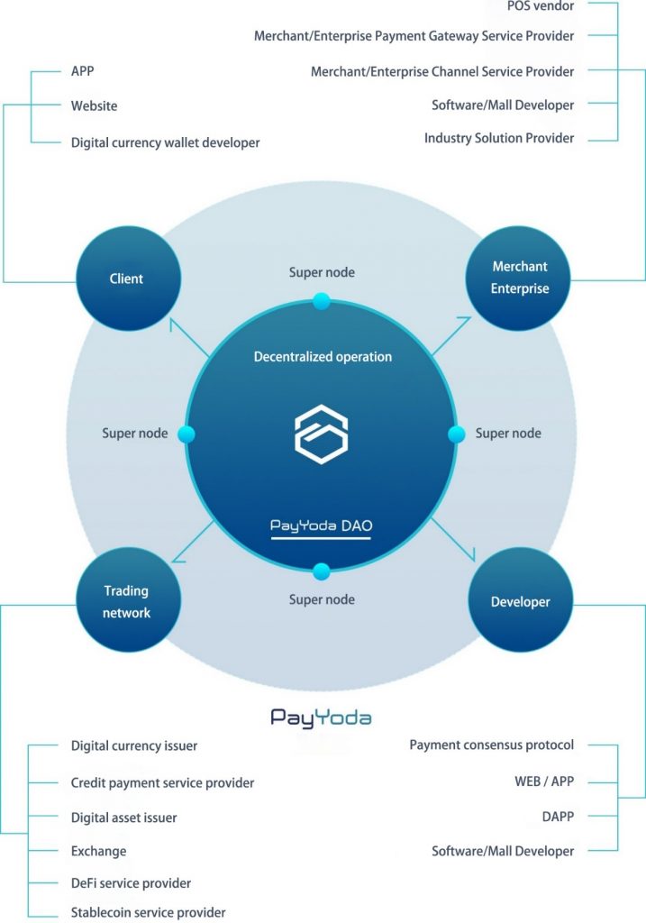 PayYoda pays increasing attention on providing payment protocols and open source development platforms, for faster access to payment agencies/channels to solve related problems or meet related needs with low-cost use of blockchain technology; Through a set of simple, practical and operable blockchain payment technology solution, it enables developers to expand and redevelop on this basis; At the same time, it links the related industrial chain to establish a block chain decentralized payment ecosystem with clear division of labor, which can improve social efficiency and reduce related costs.