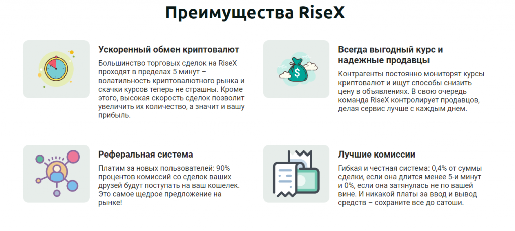 RiseX is a platform for P2P of exchange of cryptocurrencies (directly between people). Thanks to RiseX buyers and sellers of cryptocurrencies will be able to interact without risks among themselves on a convenient platform which acts as the guarantor of carrying out transactions. Distinctive features of the platform are: