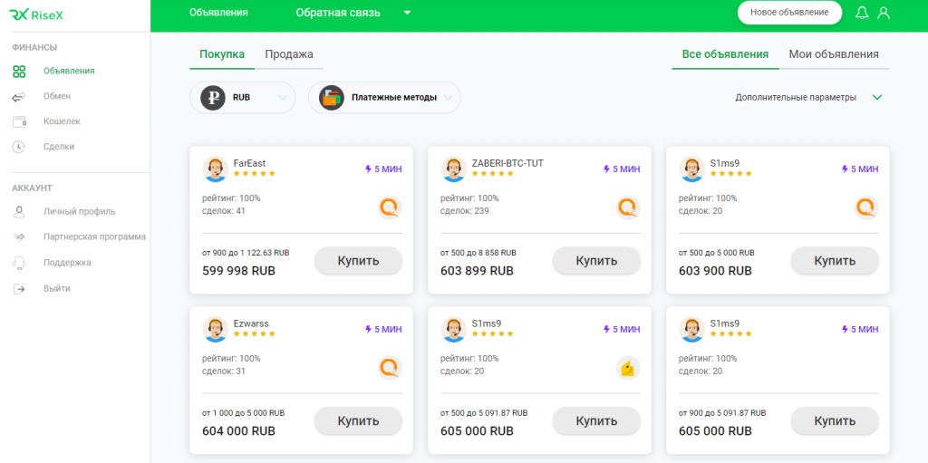 After the standard registration, we are taken to the main workspace. On the left, there are all sections, including wallet, personal cabinet, and offers. The offers section contains all active offers for buying/selling cryptocurrency.